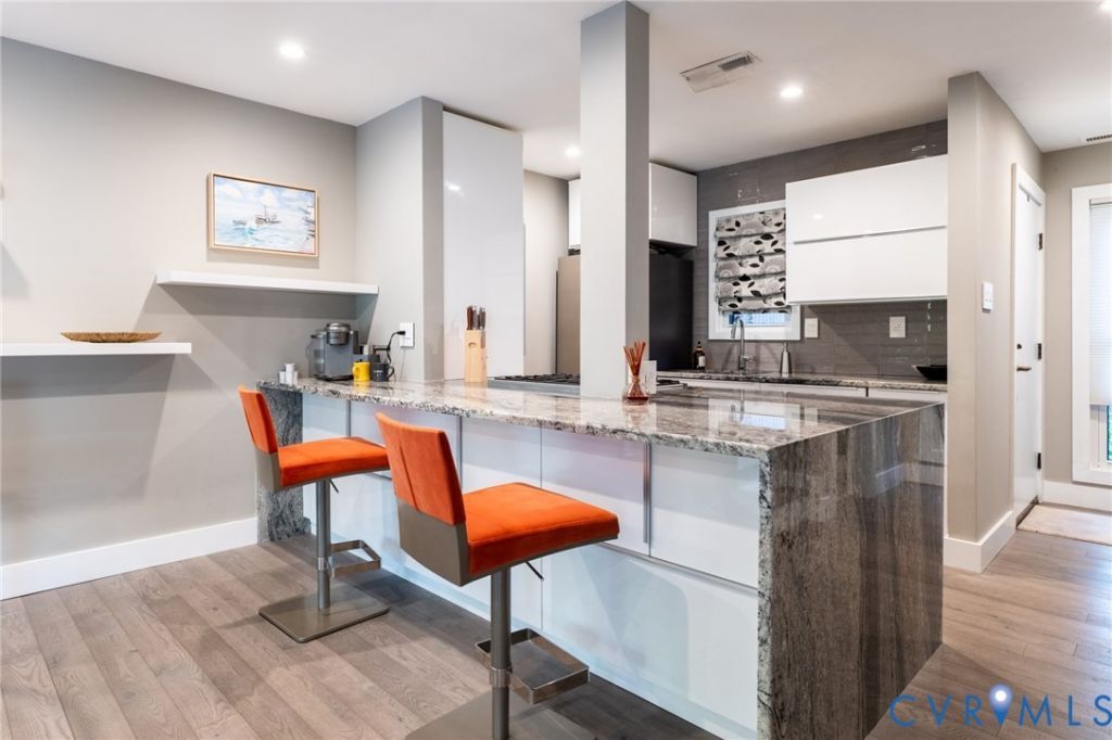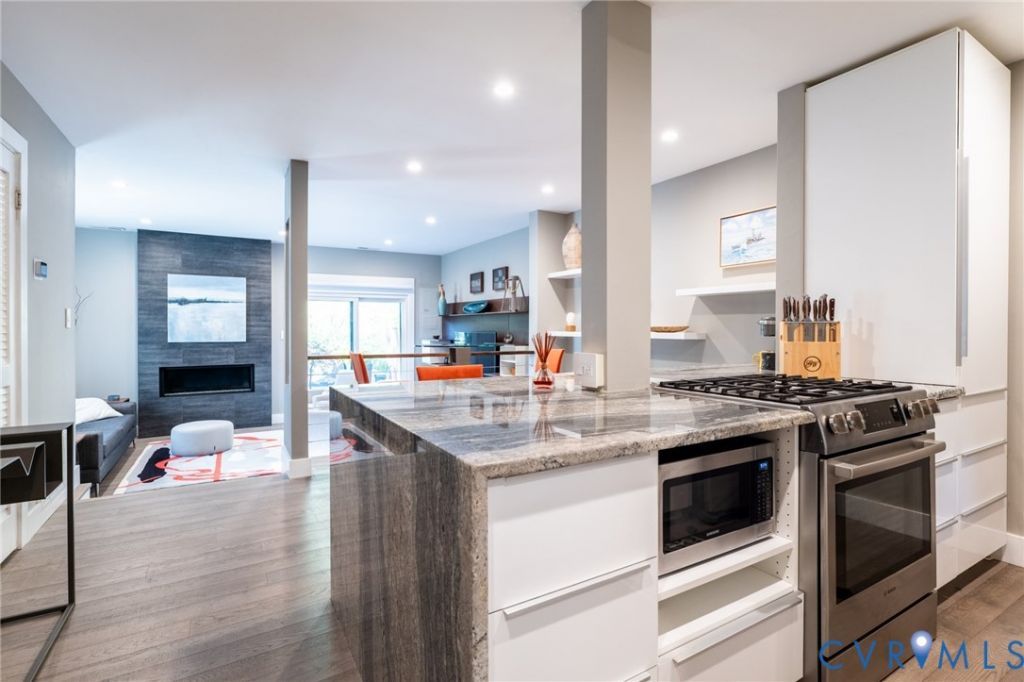 Welcome to a truly exceptional, fully renovated 2-bedroom, 1.5-bath condo in Briarwood Hearth-where ultra-modern design meets effortless indoor-outdoor living. Every inch of this home has been thoughtfully reimagined with high-end finishes and a clean, contemporary aesthetic. The stunning kitchen is the showpiece, featuring sleek Brazilian granite countertops with dramatic waterfall edges, stainless steel appliances, and a premium Bosch gas range-perfect for both everyday living and elevated entertaining. The main level has beautiful engineered maple flooring and enhanced with recessed lighting throughout. A standout feature is the step-down living room, offering a distinctive contemporary feel and centered around a sleek, modern gas fireplace-creating a stylish yet inviting space to relax or entertain. Upstairs, you'll find two bedrooms and a beautifully updated full bath featuring a double vanity with granite countertops and a fully tiled walk-in shower-delivering a spa-like experience at home. Major system upgrades provide peace of mind, including energy-efficient replacement sliding patio door, windows with modern window treatments, as well as an updated electrical panel. The attic offers pull-down access, is floored for abundant storage, and features upgraded R-38 insulation. The true magic of this home lies just beyond the walls. Step outside to a one-of-a-kind hardscape patio finished with dark large porcelain tile, offering a private, park-like setting that feels both serene and sophisticated. This space seamlessly blends indoor and outdoor living-ideal for relaxing evenings, morning coffee, or entertaining under the open sky. The HOA covers gas (including stove, heat, water heater), water, and trash-keeping utility costs remarkably low. Residents also enjoy exterior maintenance, including roof and landscaping, along with access to a community pool and tennis courts. Fully renovated, turn-key, design-forward, and unlike anything else in the community-this is Briarwood Hearth at its absolute best.