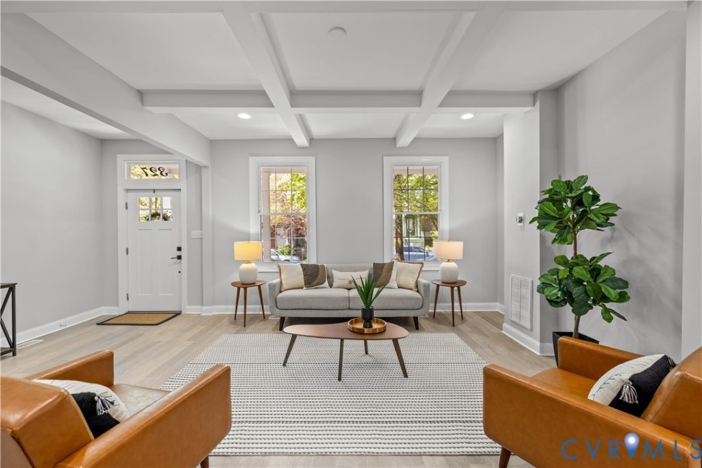 Welcome to 327 S Cherry St, a beautifully restored historic home offering the perfect blend of classic charm and modern convenience. Renovated in 2020 and freshly painted in 2026, this 3-bedroom, 2.5-bath home features updated electrical, plumbing, and a dual-zone HVAC system with Nest thermostats. Step inside to an open-concept main level featuring a spacious family room with coffered ceiling and dining area open to the stunning kitchen. The kitchen showcases white cabinetry, quartz countertops, a large stainless farmhouse sink, soft-close drawers, stainless steel appliances, gas cooking and a bar stool seating area - ideal for both everyday living and entertaining. A convenient half bath completes the first floor. Upstairs, the spacious primary suite offers a walk-in closet and a beautifully appointed ensuite bath featuring a tiled shower with frameless glass door, jet shower tower system, and double vanities. Two additional bedrooms share a well-designed hall bath with tiled tub and tile flooring. The finished basement provides additional flexible living space along with washer/dryer hookups, two unfinished interior storage areas, and two exterior storage spaces. Out front, enjoy a welcoming front porch overlooking charming flower beds and a classic white picket fence, adding to the home's curb appeal. Enjoy outdoor living with a screened back porch, a small brick patio, a spacious fully fenced yard with privacy fencing, and rare off-street parking for up to three vehicles. Located in the heart of Oregon Hill, this home is just a short walk to L'Opossum and VCU. A truly move-in ready home with incredible style and location!